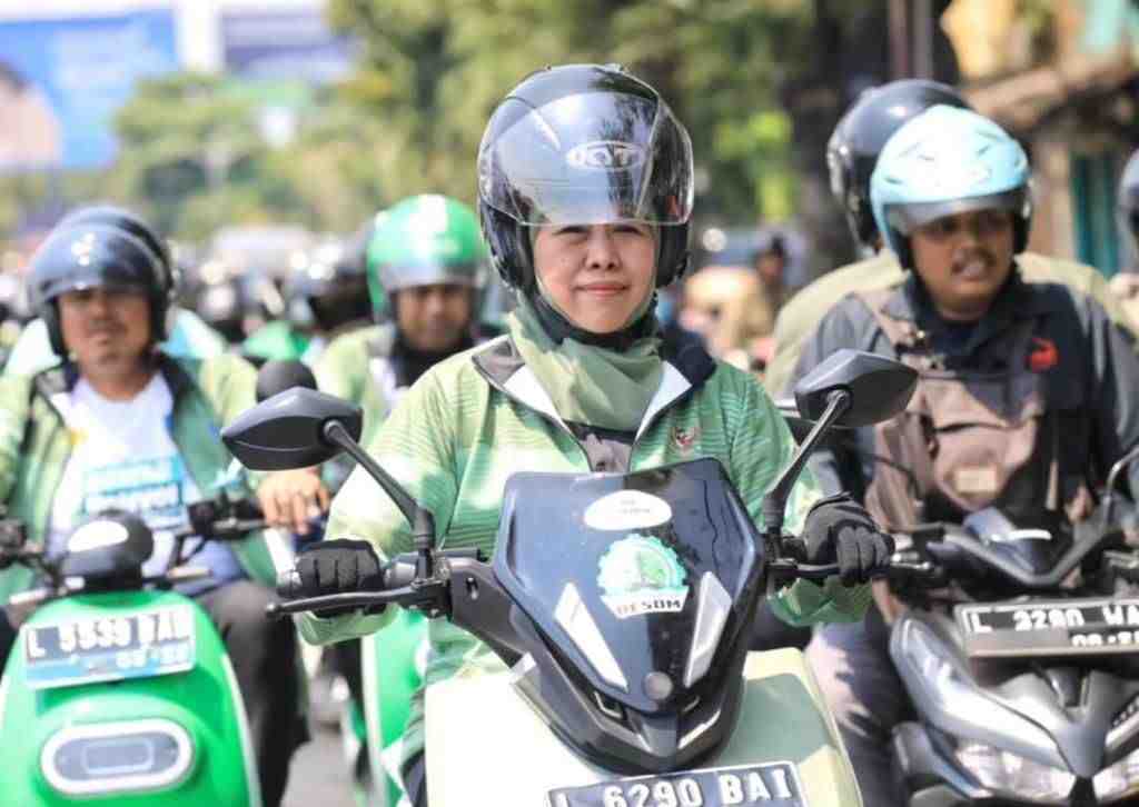 (Beritadaerah – Surabaya) Tampak Gubernur Jatim, Khofifah Indar Parawansa sedang mengendarai motor listrik pada acara Gebyar Konvoi Motor Listrik di Surabaya, Jawa Timur, Selasa (24/10). Sebanyak 700 motor listrik melakukan konvoi start dari Grahadi dan finish di Masjid Al Akbar. Konvoi motor listrik ini diikuti serentak oleh 888 motor listrik di 12 Kabupaten/Kota di Jawa Timur. Konvoi motor listrik serentak diikuti 1.588 peserta dan berhasil meraih rekor MURI. Foto: Pemprov Jatim